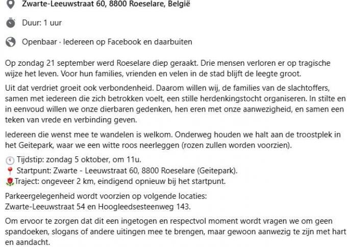 De feiten van zondag 21 september zinderen nog na in Roeselare, niet in het minst natuurlijk bij de families en vrienden van de drie dodelijke slachtoffers die vielen. Daarom wordt nu op zondag 5 oktober om 11 uur een Stille Optocht gehouden.