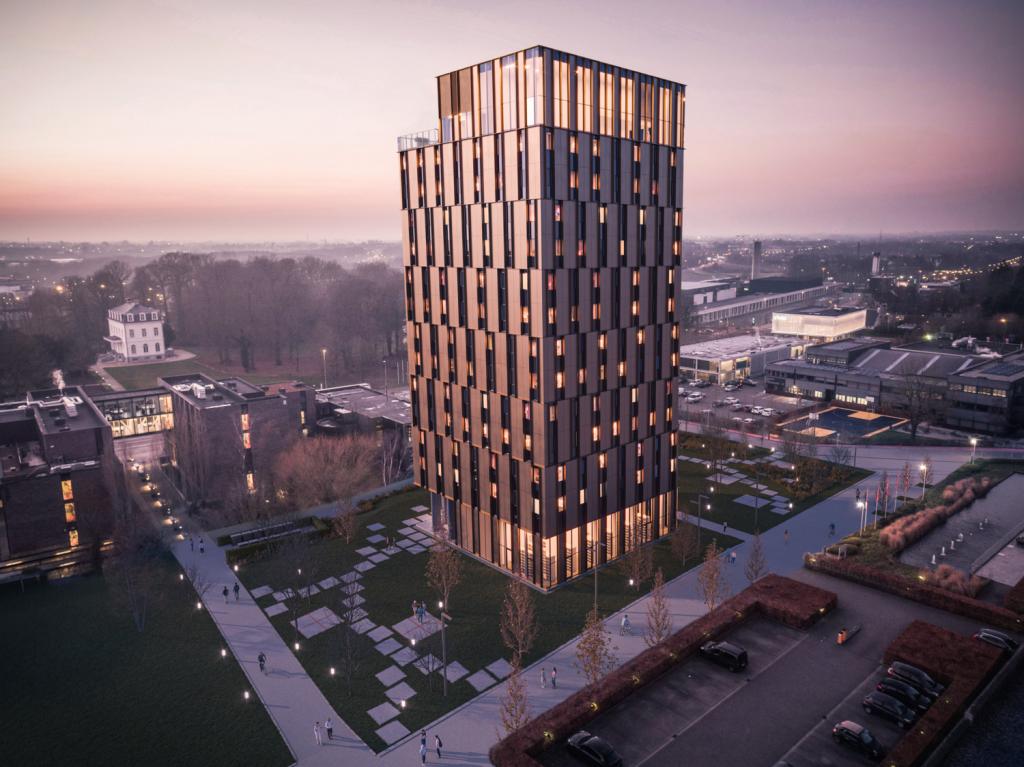 ‘The Sky’ telt straks zestien verdiepingen en 192 studentenkamers met privésanitair. Op het gelijkvloers komt een broodjes- en soepbar, terwijl bovenaan een polyvalente ruimte met dakterras uitzicht biedt op het 3.439 vierkante meter grote park. Verder is er plaats voor twee studeerruimtes en een fietsenstalling voor 600 fietsen. “Met dit project is VIVES klaar om de groei aan studenten nog beter op te vangen”, zegt Boris Parmentier, project development director bij ontwikkelaar ION.