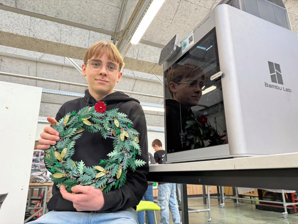 Een schoolbank verder zit Jonas Deprez (13) uit Zonnebeke geconcentreerd te werken aan een laptop. Naast hem schiet een 3D-printer in werking. “Ik print poppies voor onze serene, maar unieke herdenkingskransen uit LEGO. Op Wapenstilstand zullen we ze neerleggen onder de Menenpoort. Het wordt een bijzonder eerbetoon.” (Lees verder onder de foto)