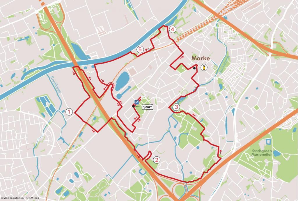 We komen uit op het jaagpad van de Leie, waar we wat verder opnieuw linksaf slaan aan een houten bruggetje. In de Leieweg zoeken we het links wat hogerop om dan opnieuw rechts ’t Schrijverke in te trekken. Boven ons torent de achterkant van Vandewiele, sinds 1880 de grootste werkgever van Marke. Terug op het jaagpad gaan we linksaf in het Pontepad, genoemd naar een sinds lang verdwenen veer op de Leie, om dezelfde weg terug te nemen naar de startplaats op het Olympiadeplein.