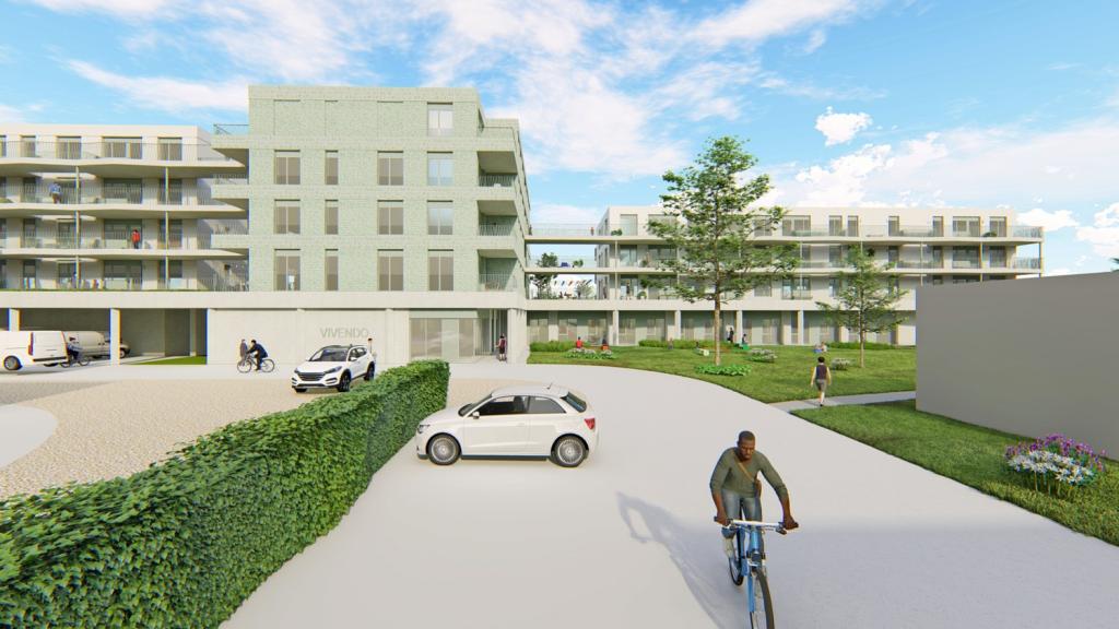 Doenja Van Belleghem vervolgt: “De sokkel, die de nieuwe kantoren van Vivendo zal huisvesten, vormt de stevige basis van het gebouw, erboven komen vier woonlagen met appartementen. Boven het gelijkvloers is het volume opgedeeld in drie delen, gescheiden door een brede open zone die visueel doorzicht biedt naar de achterliggende natuur en dienstdoet als collectieve daktuin. Deze organisatie rond een gemeenschappelijke ruimte bevordert de sociale interactie tussen bewoners.”