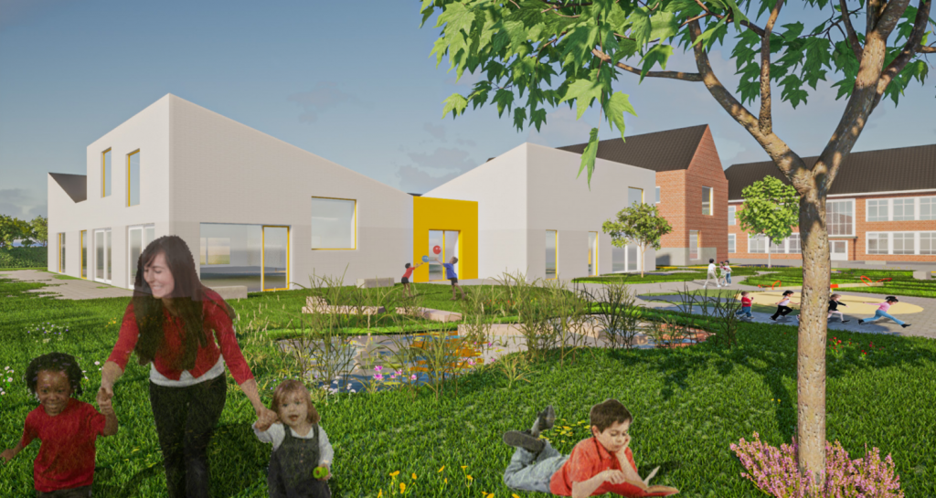 Ook de buitenruimte wordt volledig hertekend. “De speelplaats krijgt een grondige metamorfose en wordt omgevormd tot een groene, stimulerende en uitdagende speelzone. Het doel is om kinderen niet alleen meer ruimte te bieden, maar ook meer mogelijkheden voor spel, beweging en ontdekkend leren.”