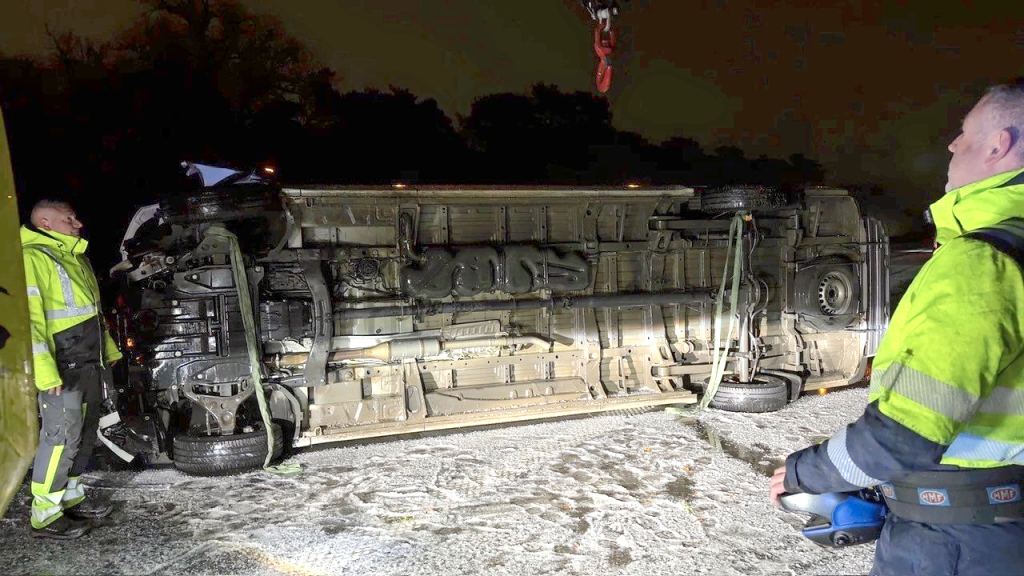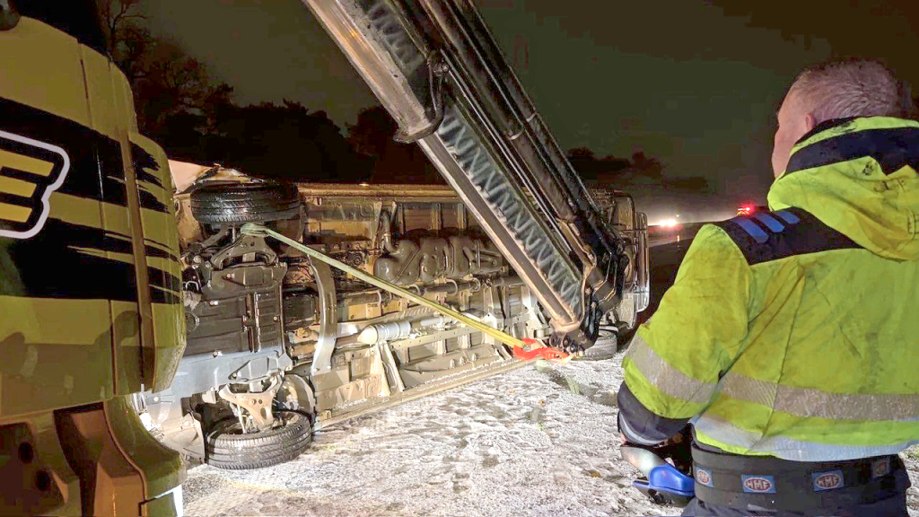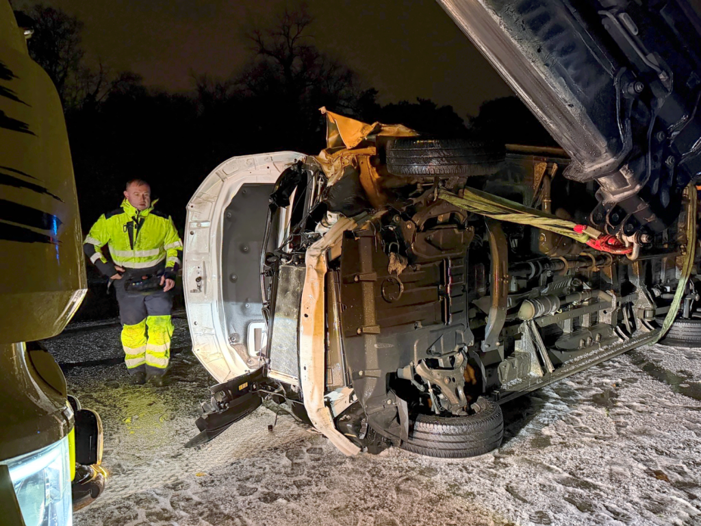 Dat was onder meer het geval in Sint-Andries bij Brugge waar een bestelwagen die richting Brussel reed. Op het gladde wegdek ging het voertuig aan het slippen en belandde tegen de vangrail. Daarbij kwam de bestelwagen op zijn zij terecht. De bestuurder werd door de hulpdiensten uit zijn cabine geholpen en naar het ziekenhuis overgebracht.