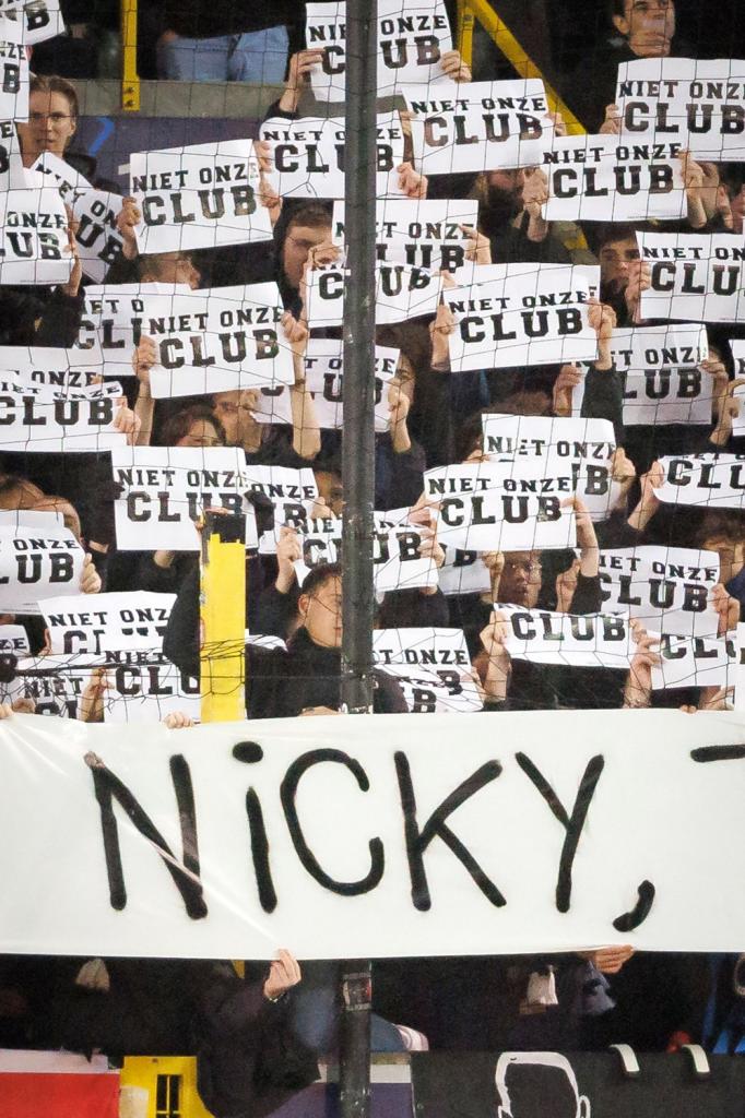 Opmerkelijke protestactie in het Jan Breydelstadion woensdagavond tijdens de Champions League-wedstrijd tussen Club Brugge en Arsenal. In de twaalfde minuut pakten de Club-supporters uit met een stevig statement om ex-coach Nicky Hayen een hart onder de riem te steken.