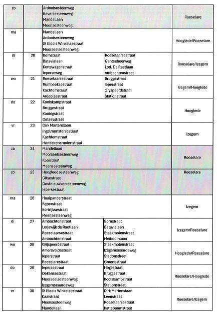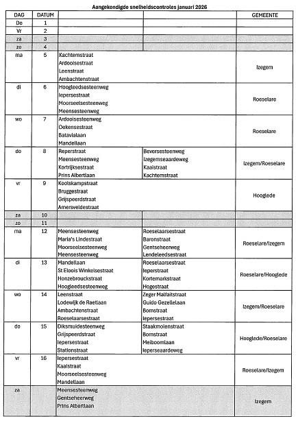 De politiezone RIHO maakte de snelheidscontroles voor de maand januari al bekend. De eerste dagen van het jaar ligt de focus nog elders, daarna wordt er haast dagelijks (aangekondigd) gecontroleerd op snelheid in Roeselare, Hooglede en Izegem.
