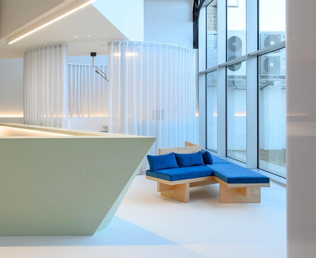 “Op zich is dit al een contradictorisch idee, en de bijzondere materialen en vormgeving maken het project nog uitdagender. Zo hebben we de driehoekige balie uit polyester ter plaatse afgewerkt”, vertelt Marie.