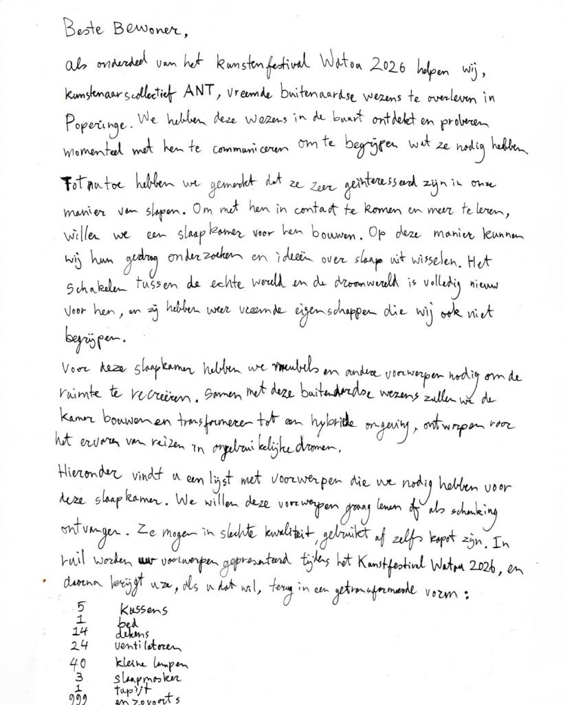 “Wie de voorbije week een handgeschreven brief in de bus vond, vroeg zich misschien af wat er gaande was. Geen vergissing: het internationale kunstenaarscollectief ANT Collective trok door de dorpskern van Watou met een bijzondere oproep”, zegt Annemie Morisse, coördinator van Kunstenfestival Watou. “Voor het jaarlijkse Kunstenfestival Watou in de zomer van 2026 wil ANT Collective leegstaande ruimtes in het dorp inrichten voor een fictief buitenaards volk. Tijdens het festival, van 14 juli tot en met 31 augustus 2026, nemen die denkbeeldige bewoners hier tijdelijk hun intrek, in een kunstinstallatie die opgebouwd wordt met spullen van de Watounaars zelf.”