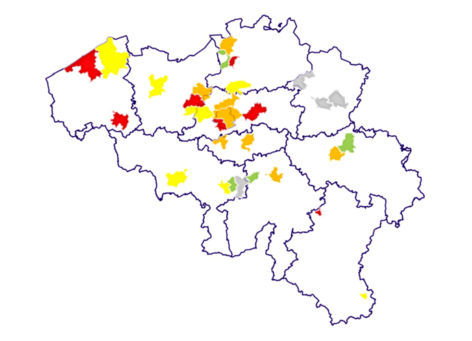 De analyses van het afvalwater in Harelbeke en Oostende tonen een zeer hoge concentratie van het griepvirus. (Kaart: Sciensano)