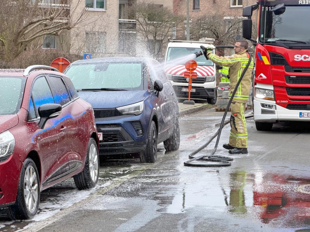 Een vrachtwagen had er aan een appartementsblok een lading aarde geleverd toen een hydraulische leiding lossprong. Daardoor kwam niet enkel het wegdek onder de olie terecht, maar ook enkele geparkeerde auto’s. Het plankerige en corrosieve goedje zette de wagens onder een laag olie. De brandweer werd opgeroepen om de gemorste olie op te ruimen en de wagens met water en detergenten grondig te reinigen. De eigenaren van de getroffen wagens werden door de politie op de hoogte gebracht van het gebeuren. De Edward de Denestraat werd door de interventie in beide richtingen even afgesloten voor het autoverkeer.